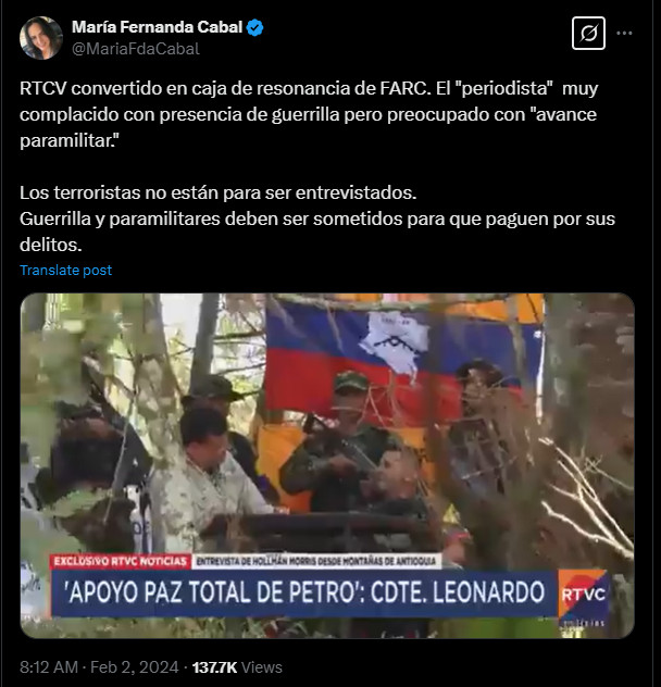 1. El 2 de febrero de 2024, la senadora María Fernanda Cabal, aseguró que RTVC es “caja de resonancia de FARC”, relacionando al Sistema de Medios Públicos con grupos armados.