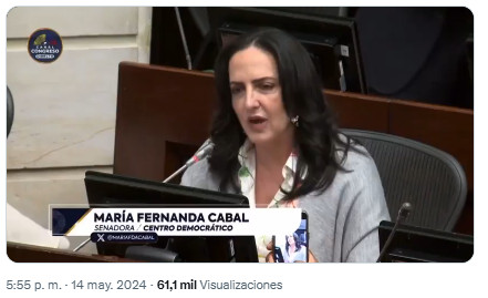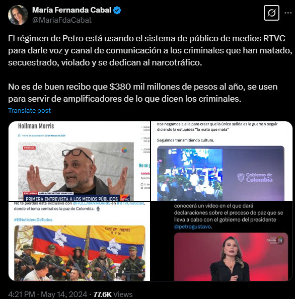 3. El 14 de mayo, la senadora María Fernanda Cabal, aseguró que RTVC es usado para darle voz a los criminales, con el objetivo de afectar la credibilidad del Sistema de Medios Públicos.