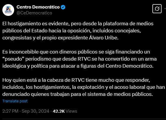 4. El 30 de septiembre de 2024, el partido Centro Democrático mediante un comunicado amenazó que el gerente de RTVC “tiene mucho que responder”, y miembros de esa corriente política estigmatizan a la entidad como medio de comunicación de grupos armados, poniendo a sus colaboradores en el blanco de cualquier agresión violenta, como ya ha sucedido con ataques a las afueras de las instalaciones, en manifestaciones públicas y en sus medios de transporte.